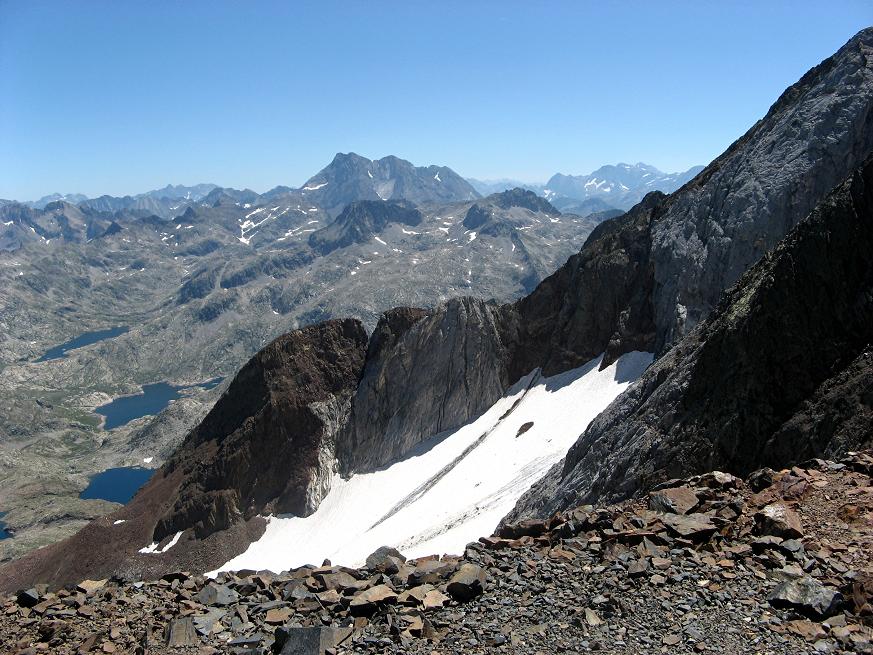 3h 40: Nouveau névé vers 2510m (qui doit probablement subsister jusqu'à la fin de l'été?): 30T 0724122; 4741048. Plus raide que le premier, on peut le remonter directement ou en prenant appui sur la petite paroi rocheuse de gauche. Une zone d'éboulis, puis un nouveau névé assez pentu se présentent: on peut le franchir avec piolet et crampons selon les conditions (se méfier de la pente); ce névé est contournable par la droite, par une raide sente d'éboulis.